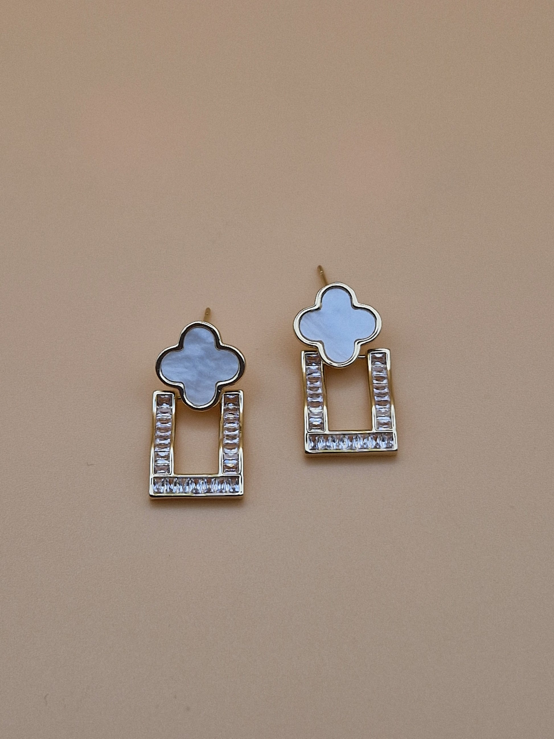 Apportez une touche de raffinement et de modernité à votre look avec les boucles d’oreilles Élégance Florale. Conçues pour les femmes au goût sophistiqué, ces boucles combinent à merveille une silhouette florale en nacre blanche nacrée, finement entourée de métal doré, à une base géométrique rectangulaire incrustée de zirconiums étincelants.